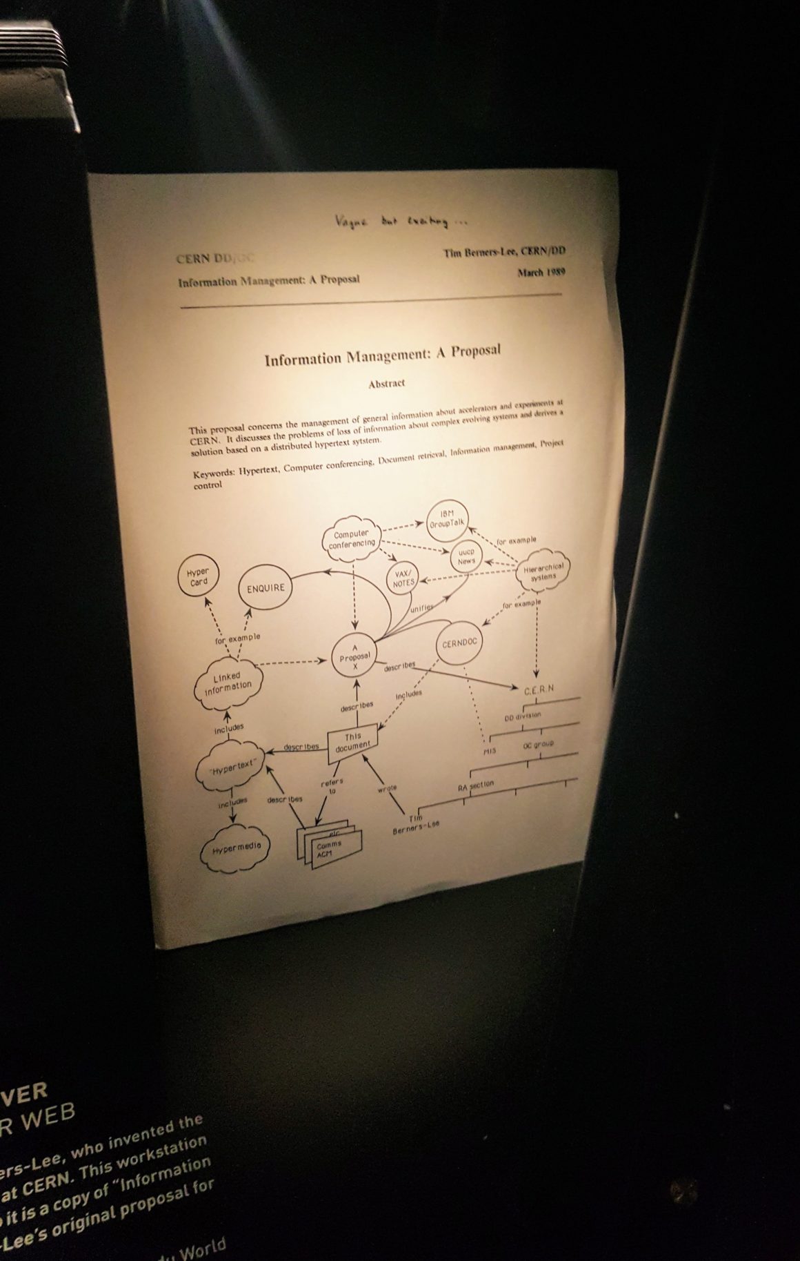 CERN is also the birthplace of the World Wide Web. The World Wide Web began as a CERN project named ENQUIRE, initiated by Tim Berners-Lee in 1989 and Robert Cailliau in 1990. Based on the concept of hypertext, the project was intended to facilitate the sharing of information between researchers. The first website was activated in 1991. On 30 April 1993, CERN announced that the World Wide Web would be free to anyone. A copy of the original first webpage, created by Berners-Lee, is still published on the World Wide Web Consortium’s website as a historical document.